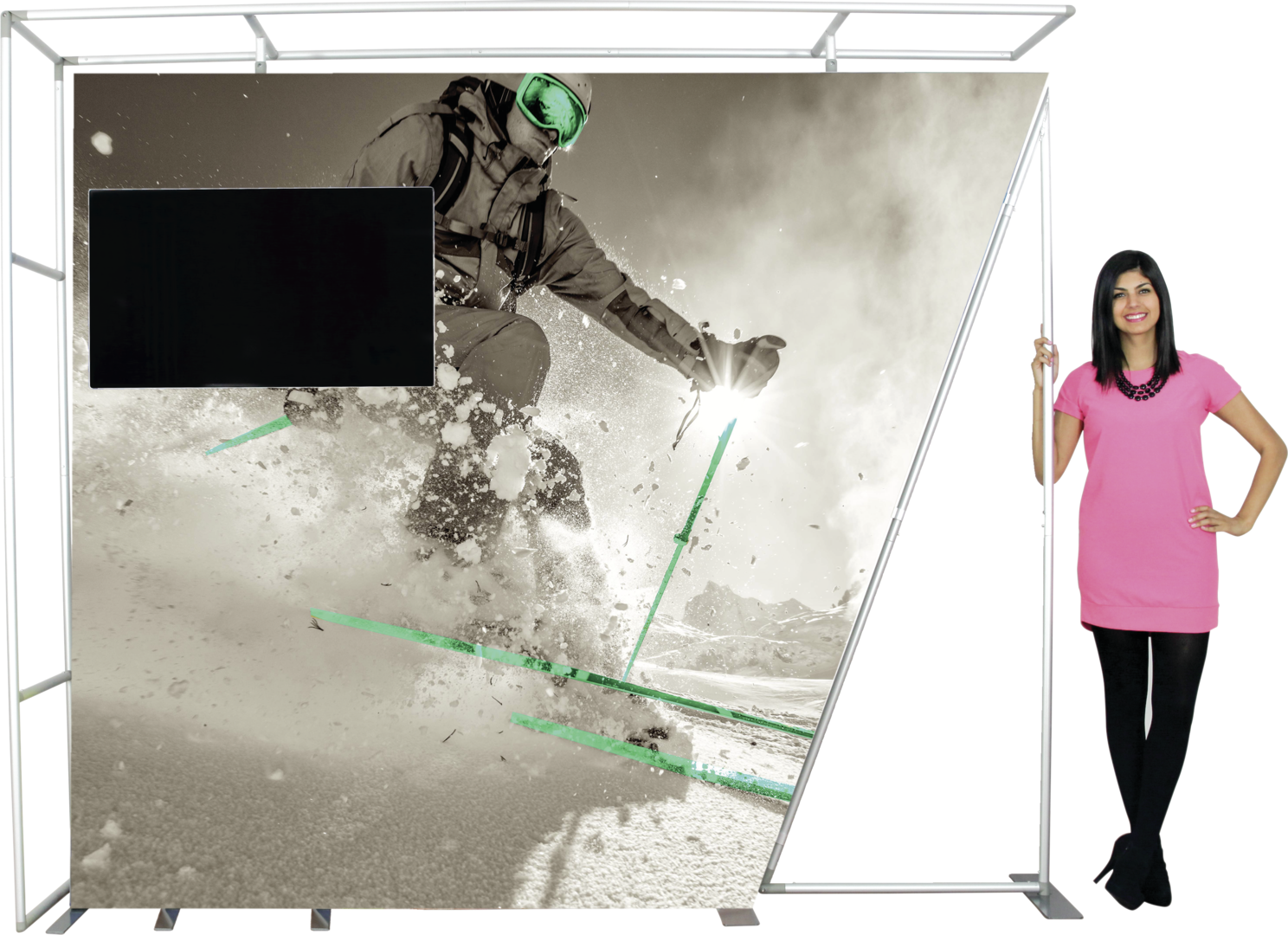 Formulate® Designer Series 10ft Fabric backwall Kit 08 is a sophisticated fabric exhibit that features two aluminum tube frames for the backwall featuring snap/button spigot connections, a kiosk supporting a medium monitor mount for multimedia display, a tubular/fabric canopy, and simple pullover zipper pillowcase fabric graphics. Designer Series Kit 08 comes in three portable, expandable wheeled transit cases for easy storage and transport. Assembly and graphic attachment is easy - simply pull the pillowcase fabric graphics over the frame and zip.