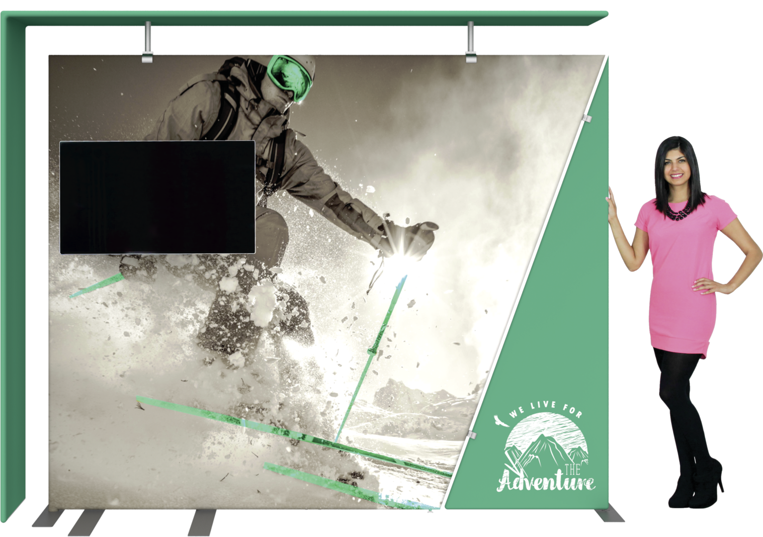 Formulate® Designer Series 10ft Fabric backwall Kit 08 is a sophisticated fabric exhibit that features two aluminum tube frames for the backwall featuring snap/button spigot connections, a kiosk supporting a medium monitor mount for multimedia display, a tubular/fabric canopy, and simple pullover zipper pillowcase fabric graphics. Designer Series Kit 08 comes in three portable, expandable wheeled transit cases for easy storage and transport. Assembly and graphic attachment is easy - simply pull the pillowcase fabric graphics over the frame and zip.