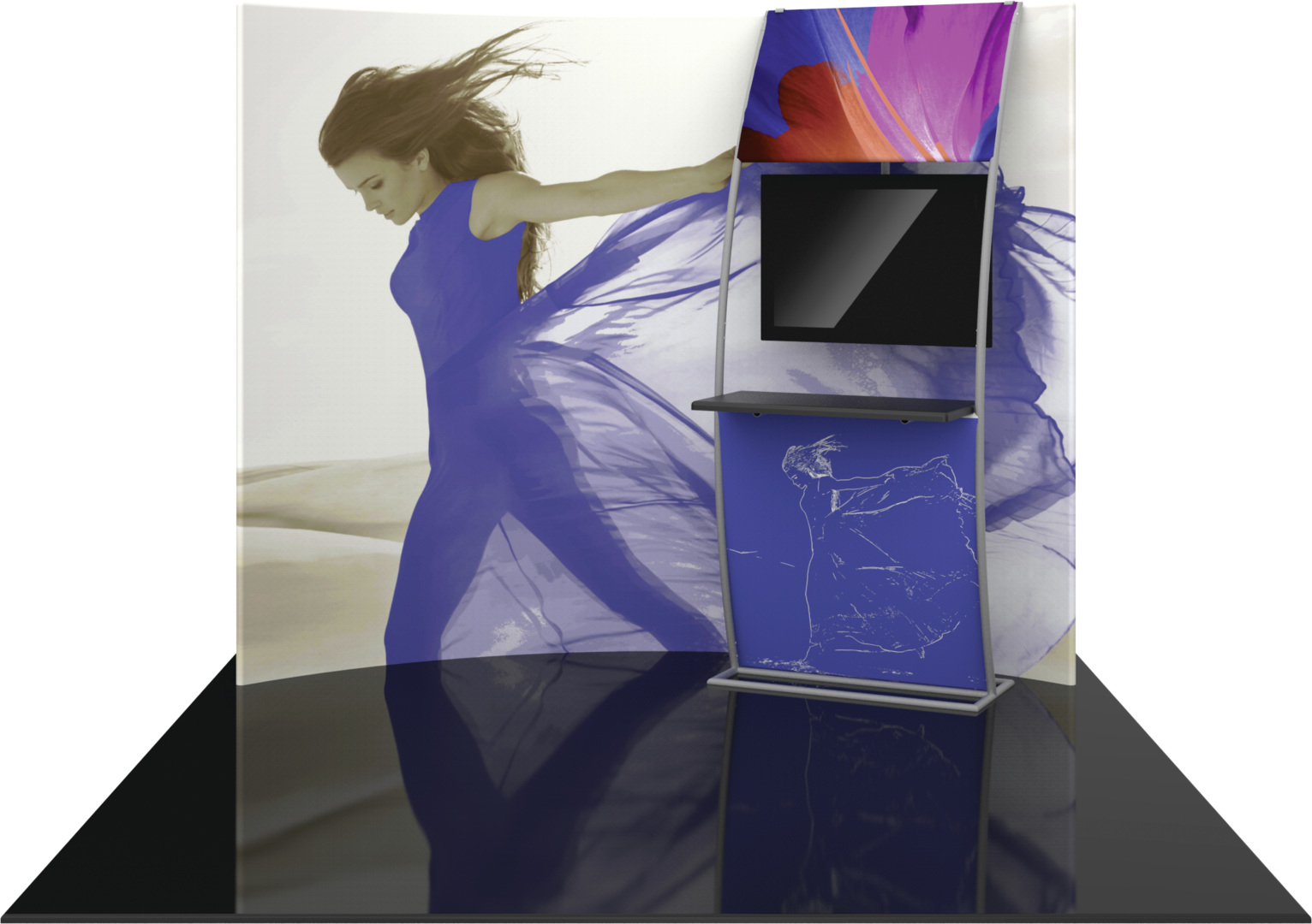 The Formulate® 10ft Horizontal Curve 6 Tension Fabric Display combines style and functionality with its highly portable aluminum tube frame and striking custom fabric graphics. This display features an accent ladder with fabric graphics, top, and bottom, as well as a wide counter area and a monitor mount designed for a medium monitor display. Stretch fabric graphics are hand-sewn, durable, and dry-cleanable.