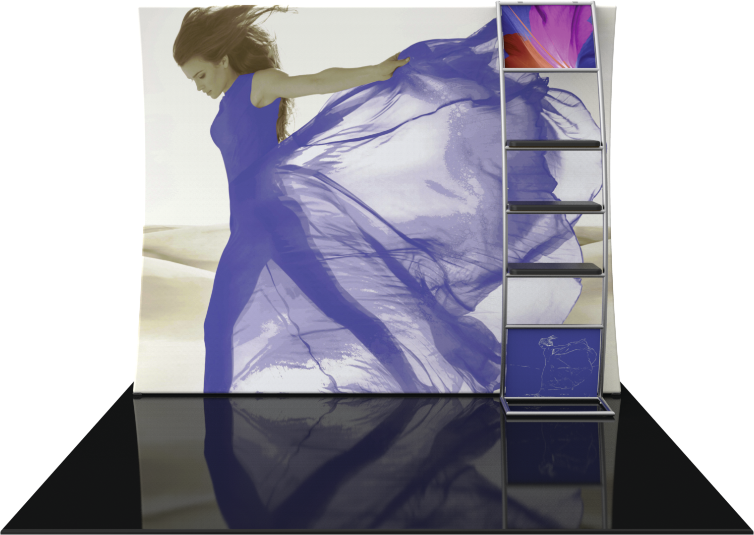 The Formulate® VC10 Vertical Curve 10ft Fabric Display is designed to make an impact at events and trade shows, as well as a multitude of other environments. This exhibit kit features a stand-off accent ladder with three 23" shelves to display products with elegance. Durable stretch fabric pillowcase graphics pull over an aluminum tube frame and zip for a quick and easy set up.