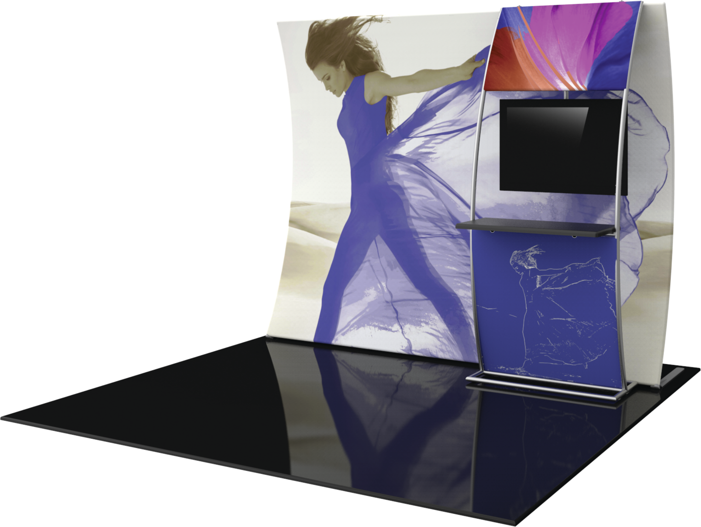 The Formulate® VC7 Vertical Curve 10ft Fabric Display is a dynamic display that utilizes a lightweight aluminum tube frame, coupled with vibrant, custom stretch fabric pillowcase graphics. This popular exhibit kit features an accent ladder that houses a medium monitor mount and countertop, adding functionality with style.