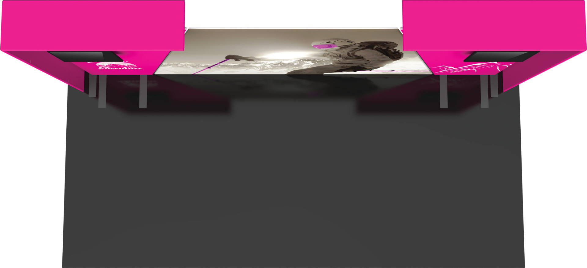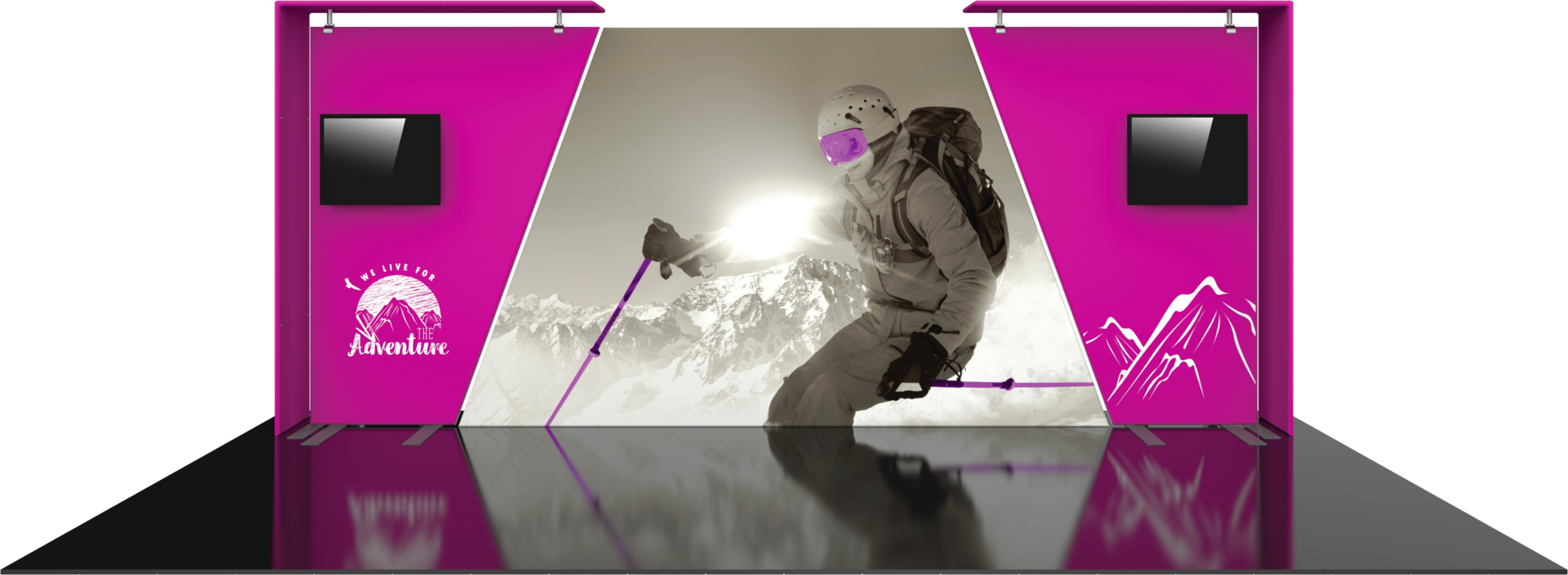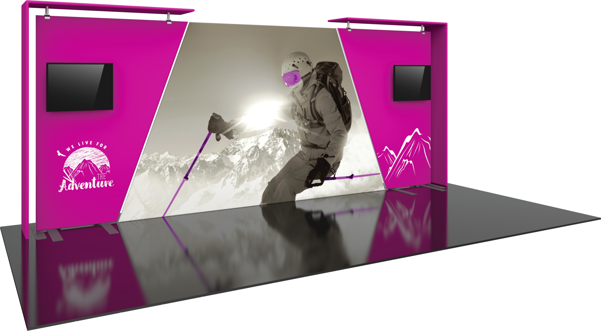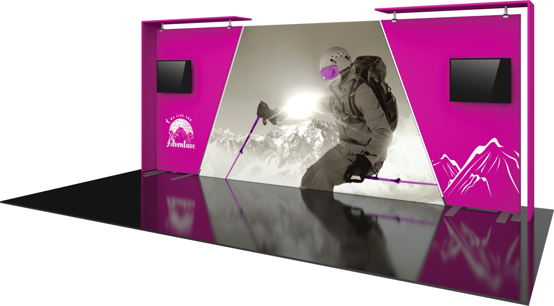 Formulate® Designer Series 20ft Backwall Kit 07 is a sophisticated, modern, and head-turning exhibit. The kit features three aluminum tube structures, two fabric canopies, and two monitor mount kiosks for media incorporation. A sure-fire way to make an impression on the trade show floor. Assembly is simple - connect the tube frames, place the monitor kiosks, pull the fabric graphics over the frames, and zip.