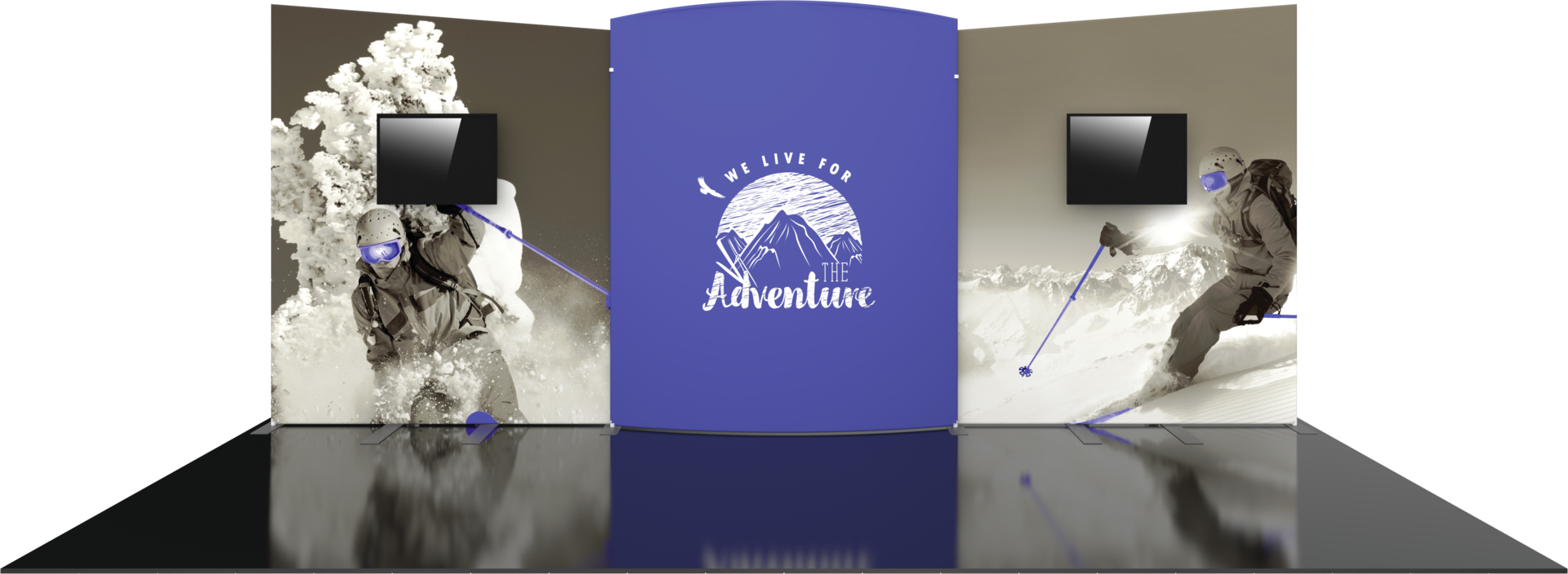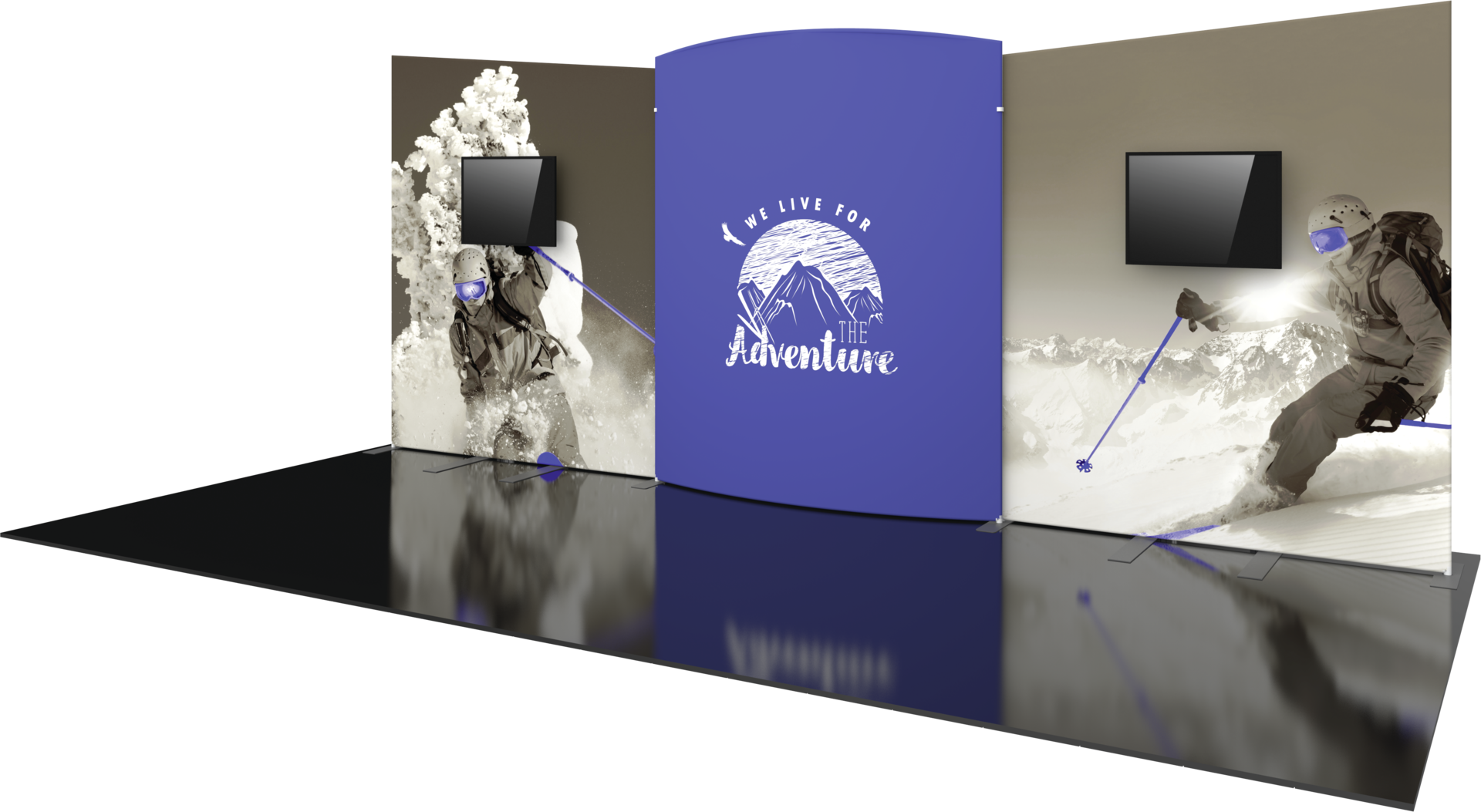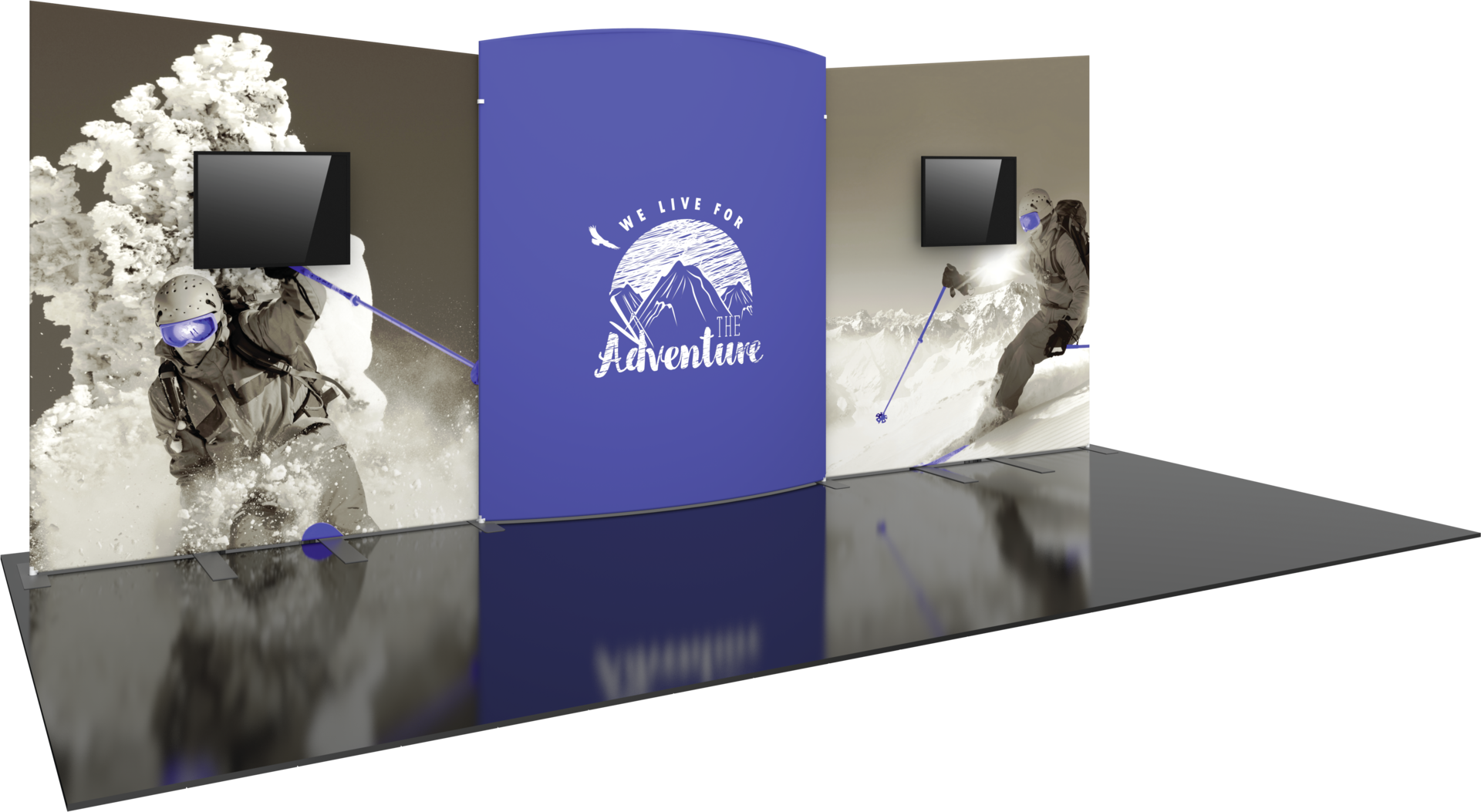 Formulate® Designer Series 20ft Backwall Kit 08 display has unique stylistic features and is portable and easy to assemble. Kit 08 features three aluminum tube frames with snap-buttons/spigot connectors, two monitor kiosks supporting medium monitors, and three zipper pillowcase fabric graphics. Assembly is simple - connect the tube frames, place the monitor kiosks, pull the fabric graphics over the frames, and zip.