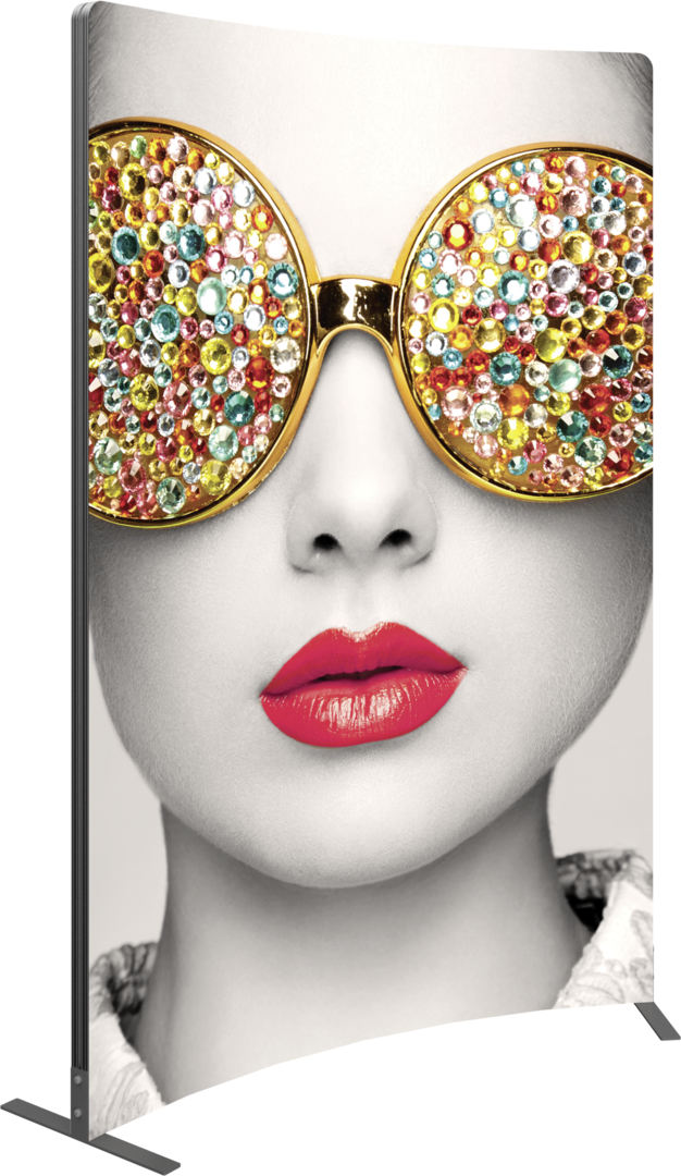 Vector Frame™ curved fabric banner 03 is a modern, extrusion-based fabric graphic banner display measuring 68"W x 94.74"H that combines 50mm aluminum extrusion frames with push-fit fabric graphics. Vector Frame Curved fabric banner 03 is a versatile single or double-sided banner, backwall, or interior display. Use as a concave or convex shape for increased versatility.